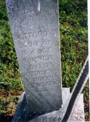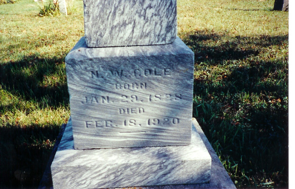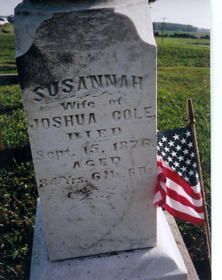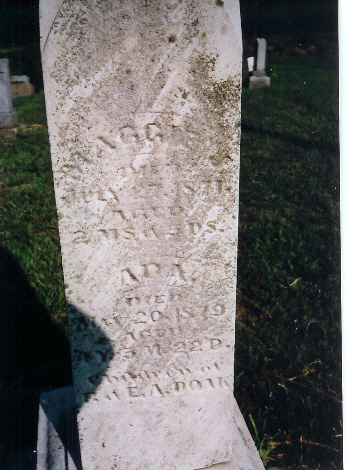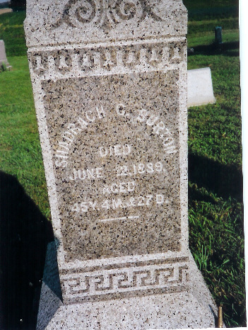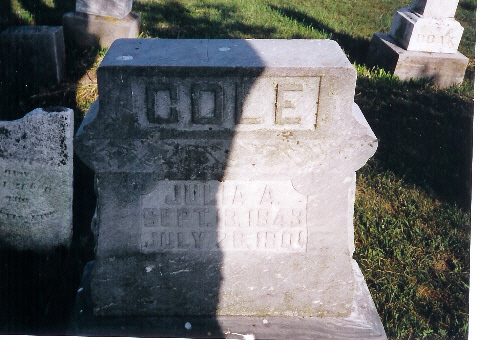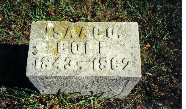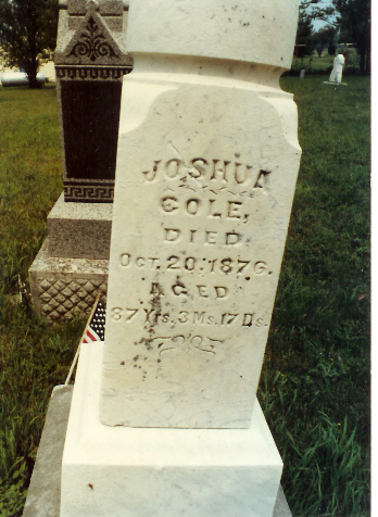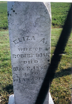 | Abel, Hester Ann d. June 14, 1893 Abel, Moses d. May 21, 1907 (veteran) Abel, Mrs. Moses d. Apr. 7, 1907 Baker, Clark J. b. Barker, Clara A. d. Aug. 13, 1898 Bonham, Della S. d. Apr. 23, 1885 Burrows, Mariah d. Oct 3, 1886 Burrows, Capt. William A. b. June 1793 d Nov 1, 1885 55th IL Inf. Burton, Ann d. May 15, 1885 Burton, Joshua d. Feb 28, 1881 Burton, Shadrack C. 1844-1889 Carey, Cynthia Catherine Cole Carey, I.N.(H.?) b Sept. 7, 1839 d. Apr 16, 1887 - Co. C, 35th Ill Inf. Carey, Isaac Newton Carey, Thomas M. d. Dec. 2, 1872 Carr, Marthie J. d. Feb 28, 1884 Carr, Noah d. Feb 10, 1893 Clark, J. Baker d. Jan. 5, 1862 - Co. E. Benton Cadets Clawson, Elizabeth Jane b. July 9, 1883 d. Feb 18, 1889 Clawson, Evalyn 1864 - 1937 Clawson, Jeremiah 1855 - 1924 Clawson, John W.A. b.Mar. 17, 1889 d. Apr 6, 1908 Close, Margaret b. Feb 20, 1820 d. Jan 5, 1900 Coil, Emma Elizabeth d. Sept 18, 1894 Cole, Franklin d. Sept. 6, 1863 (child of N.W. & M.A. Cole) Cole, Infant d. May 3, 1858 (child of N.W. & M.A. Cole) Cole, Isaac 1843 - 1862 Cole, Isaac Orlando d. May 29, 1862 Cole Joshua d. Oct. 20, 1876 Cole, Joshua d May 3, 1854 Cole, Julia Slaybaugh b. Sept. 13, 1843 d. July 28, 1901 Cole, Martha A. d. Sept. 11, 1873 Cole, N.W. b. jan 29, 1828 d. Feb. 18, 1920 Cole Susanna d. Sept. 15, 1876 Cole, Webster d. Aug. 23, 1867 (child of N.W. & M.A. Cole) Doak, Ada d. May 20, 1879 (c/o Robert & Eliza Doak) Doak, Eliza d. May 2, 1883 Doak, George S. 1885 - 1894 Doak, Maggie d. July 27, 1871 (c/o Robert & Eliza Doak) Doak, Robert 1842-1929 Doak, William A. d. Nov. 1, 1885 Doak, Willie M. 1882 - 1890 Ealy, Elizabeth Ann b. Aug. 25, 1835 d Sept 9, 1875 Ford, Bertha M. d. Aug. 20, 1874 Fosnight, Julia Ann d. Apr 2, 1856 Fosnight, Lydia Ann d. Feb. 20, 1854 Griffis, Ellmer E. 1862 - 1882 Griffis, Orah B. 1880 - 1882 |